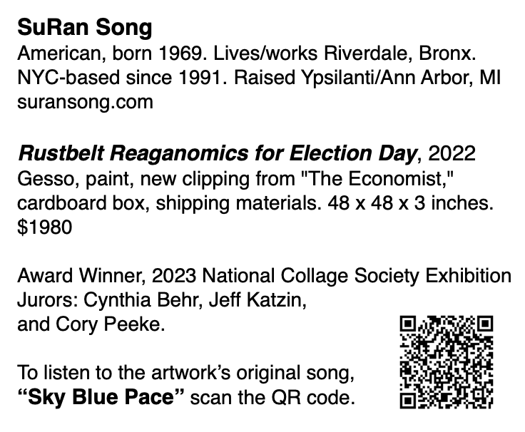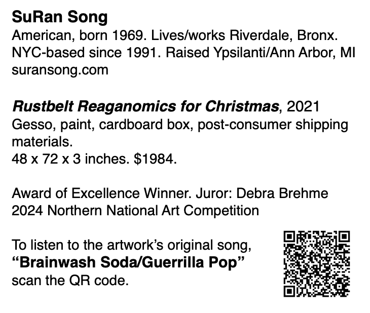 My collages, assemblages, and post-punk songs, Recollections of a Rustbelt Youth, delve into the complexities of my childhood experience in Michigan during a tumultuous time in American history, from 1977 to 1989. Through the use of post-consumer paper and packaging products as my art materials, I explore the emotional impact of the industrial decline, cultural anxiety (the beating to death of Vincent Chin), rise of hyper-consumerism, and gentrification, all of which were products of Reagan’s economic policy when he decreed that one packet of ketchup was equal to one serving of vegetables in school hot lunch programs. Recollections of a Rustbelt Youth aims to capture the essence of this period. I want to inspire a visceral, transformative understanding of the results of austerity and the challenges faced by those who lived through it.